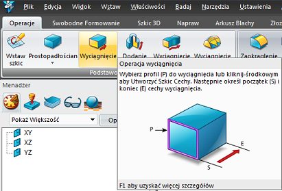 - Dobrze znane metody projektowania 3D takie jak: wyciągnięcie, wyciągnięcie po ścieżce, przez obrót, po profilach i inne.